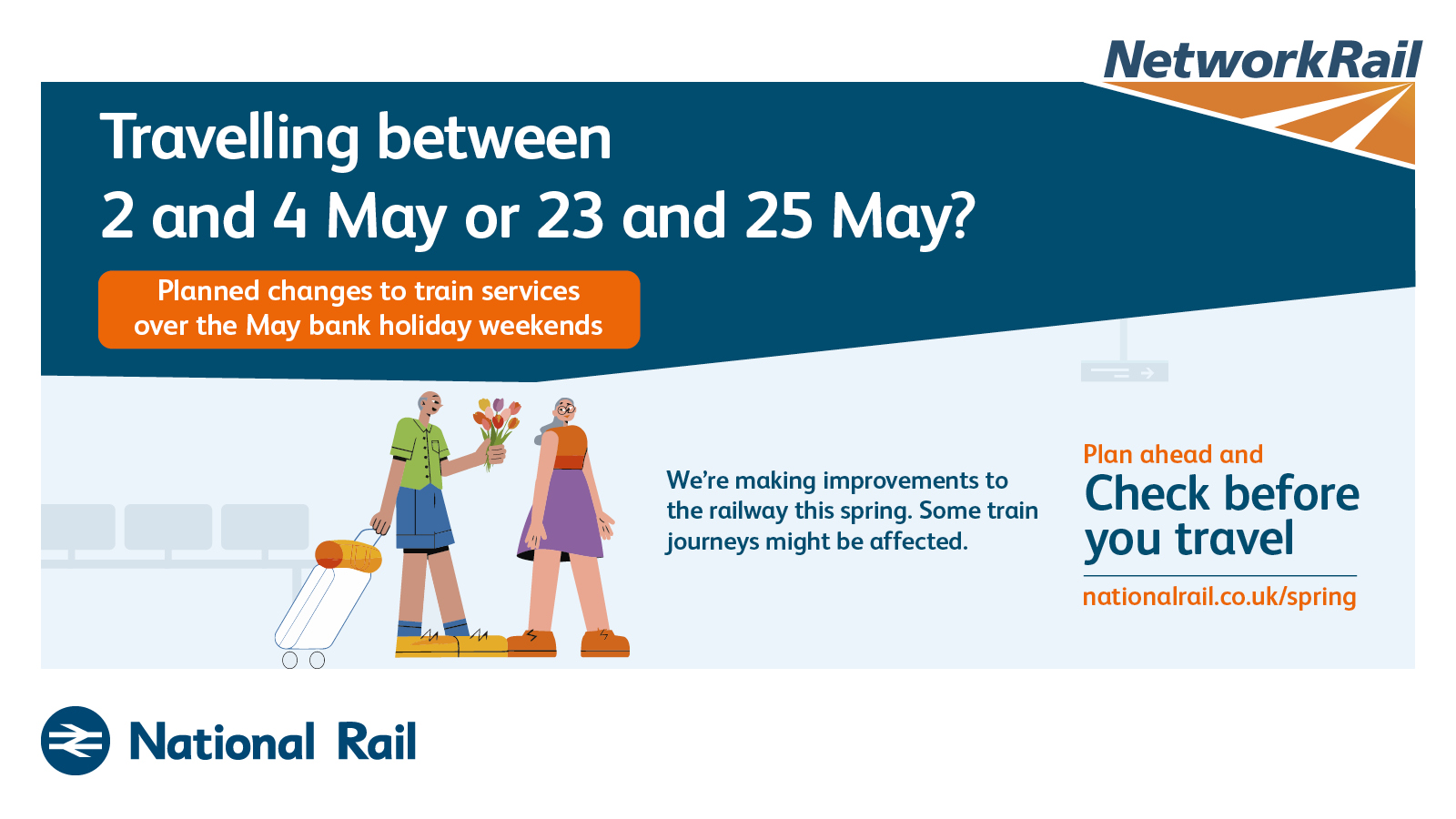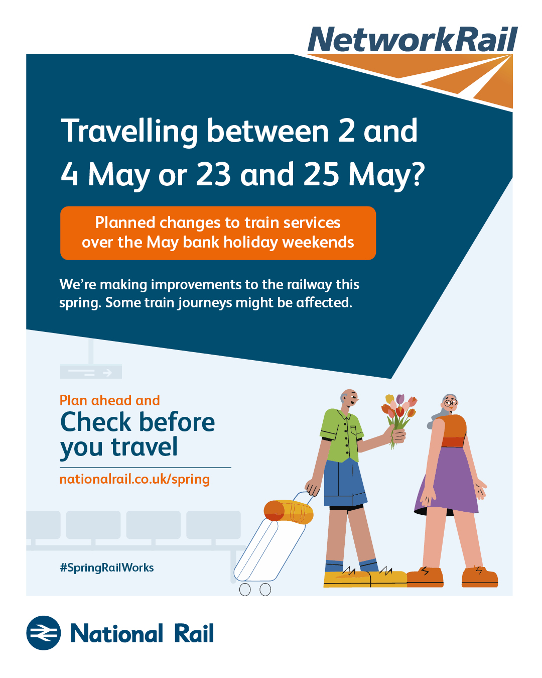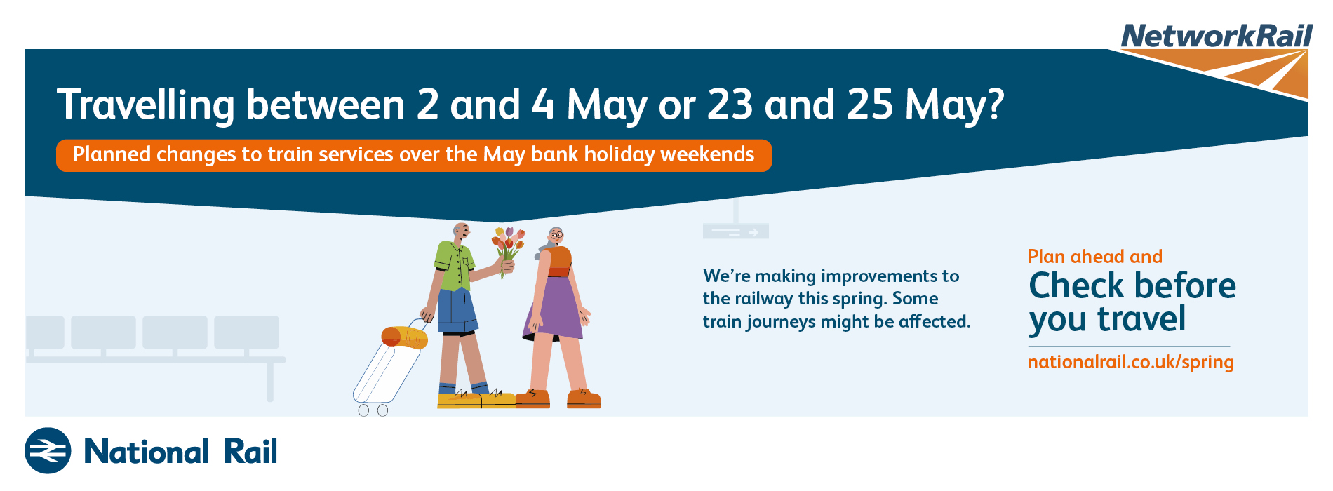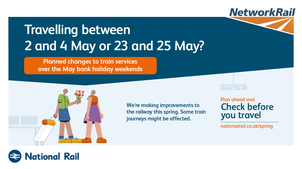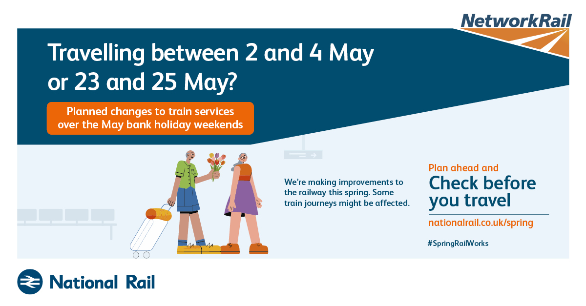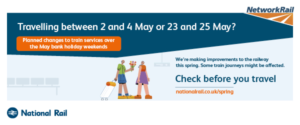 The purpose of this campaign is to raise awareness of planned rail engineering work over the spring bank holiday periods. We are encouraging leisure and business passengers to plan ahead and check if their train journey is affected before they travel by visiting www.nationalrail.co.uk/spring.