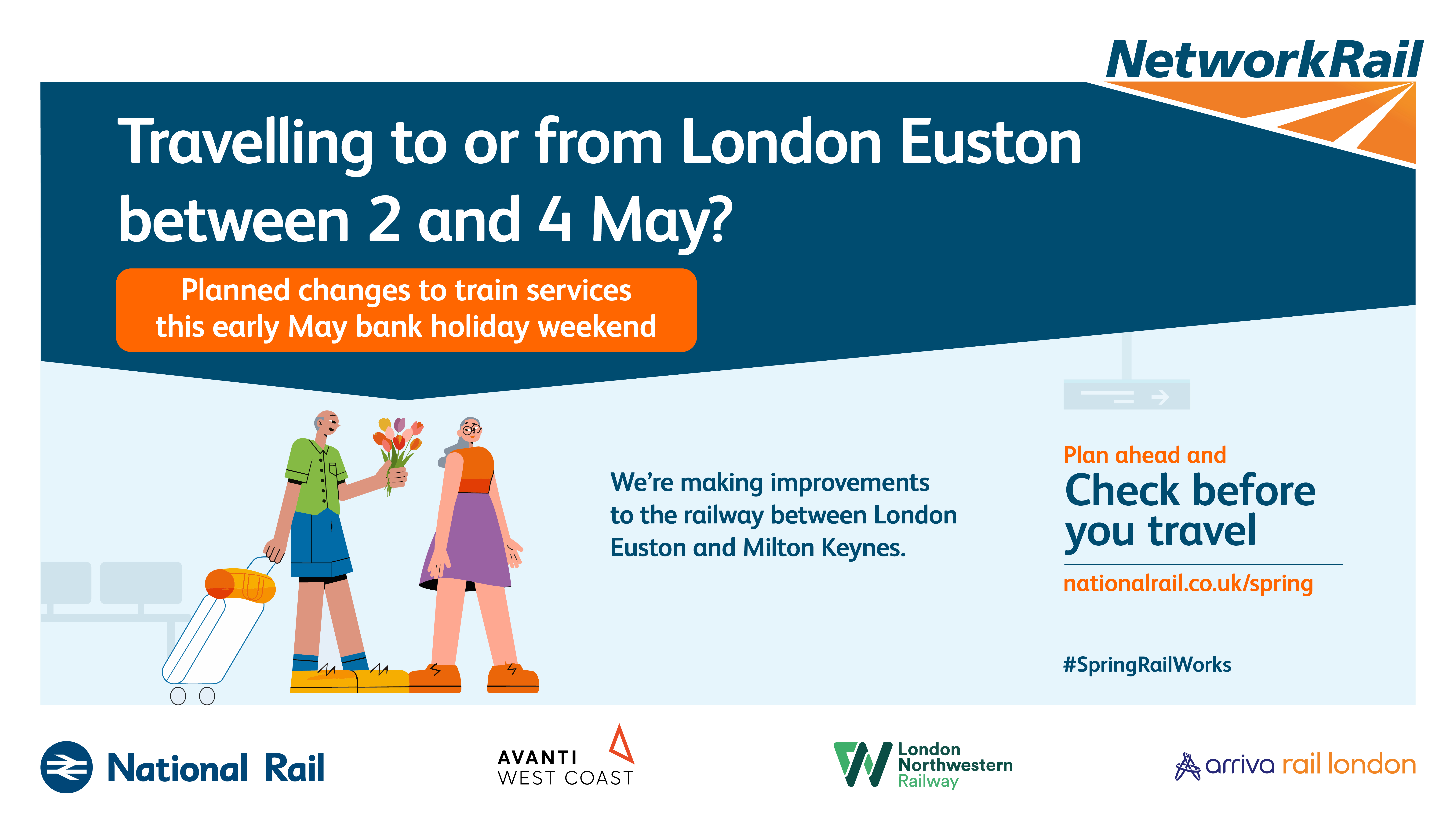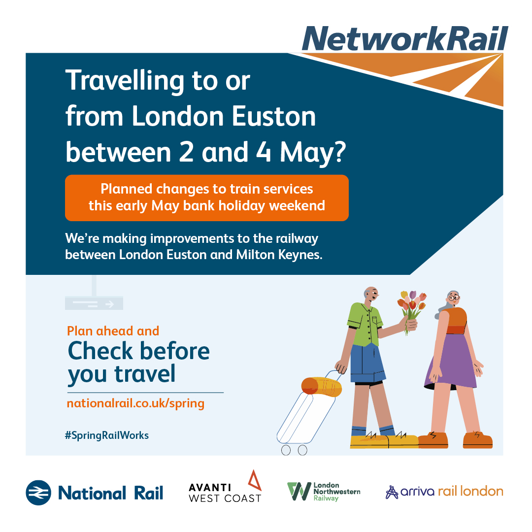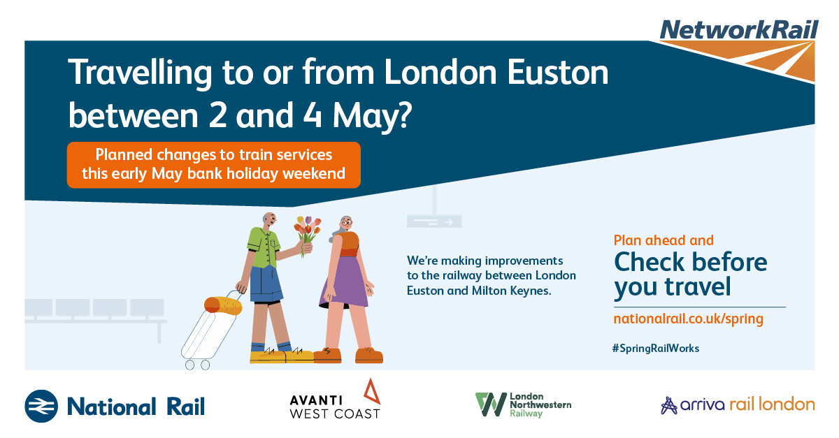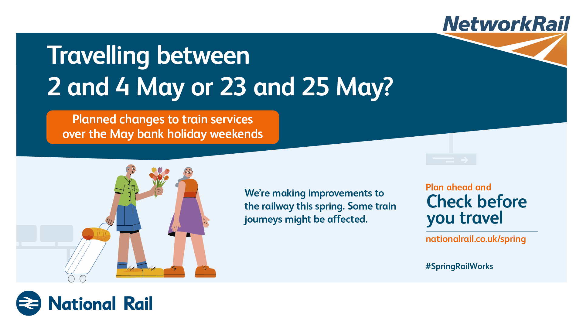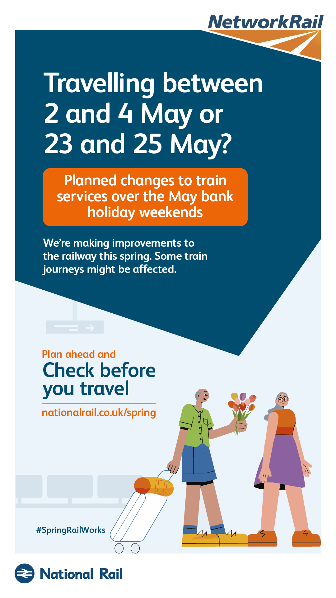 The purpose of this campaign is to raise awareness of planned rail engineering work over the spring bank holiday periods. We are encouraging leisure and business passengers to plan ahead and check if their train journey is affected before they travel by visiting www.nationalrail.co.uk/spring.