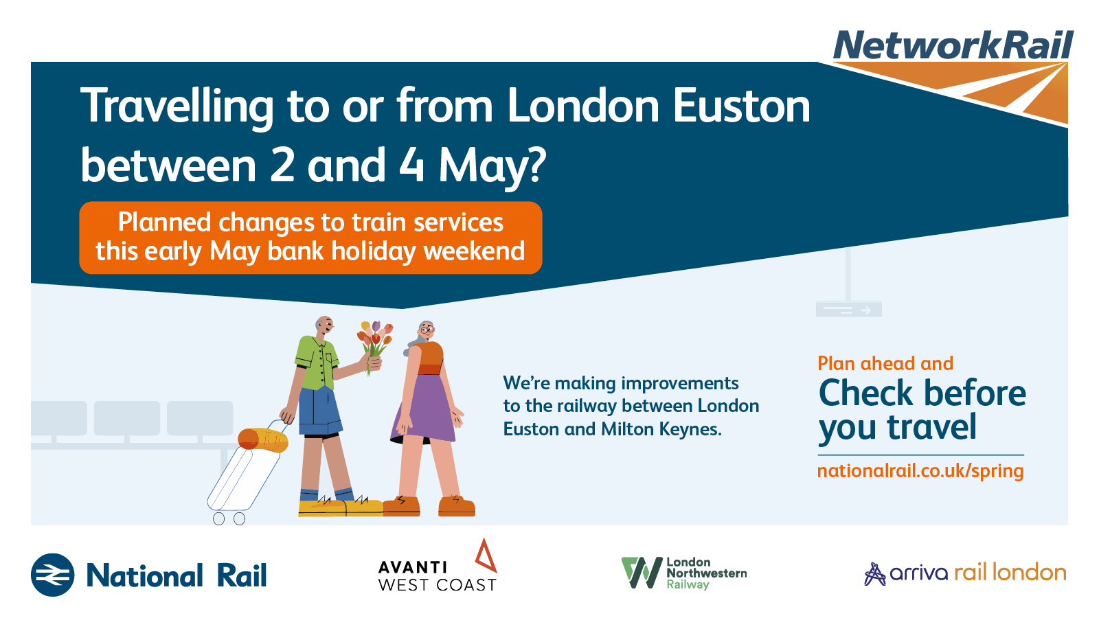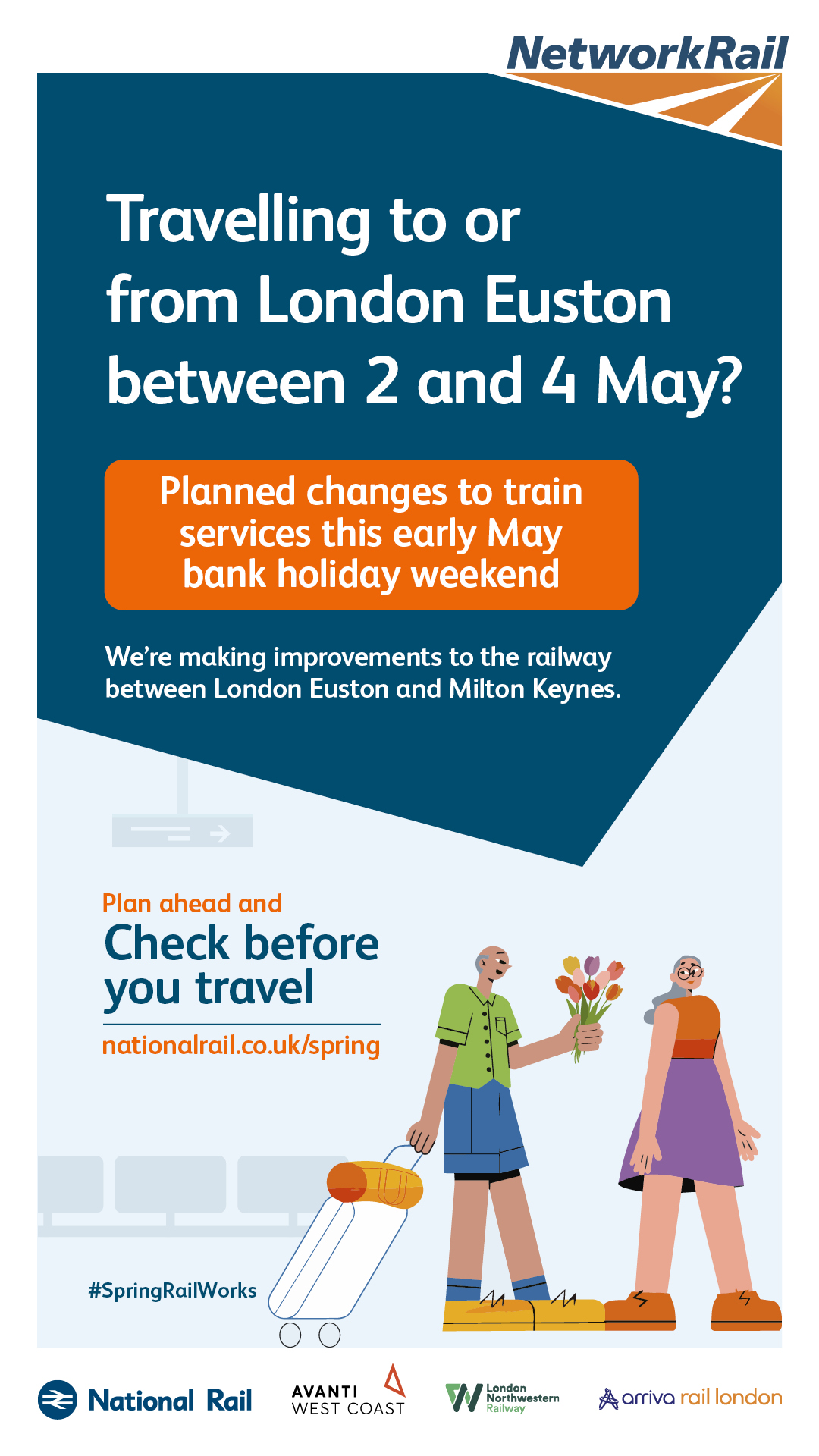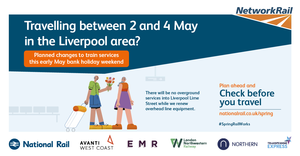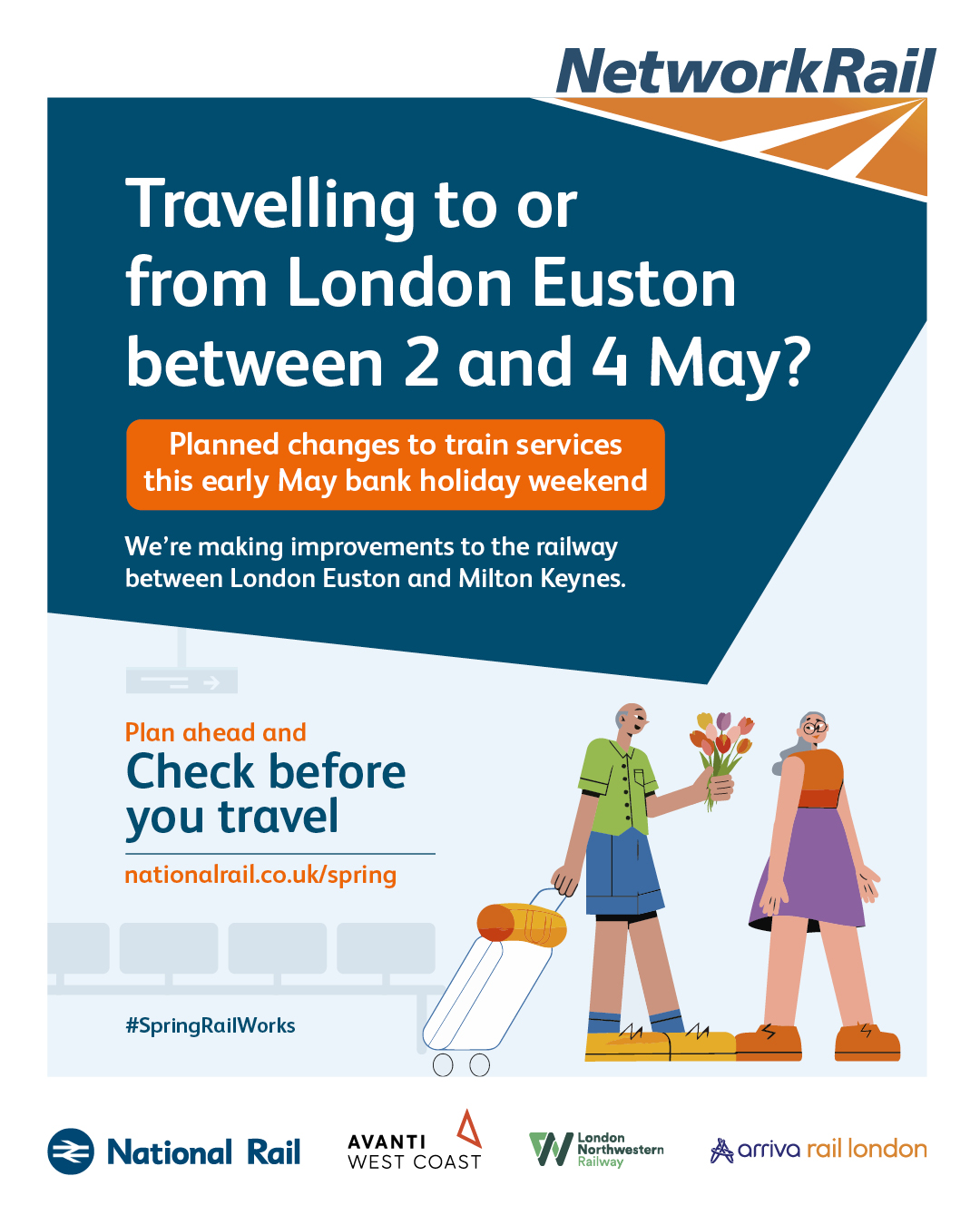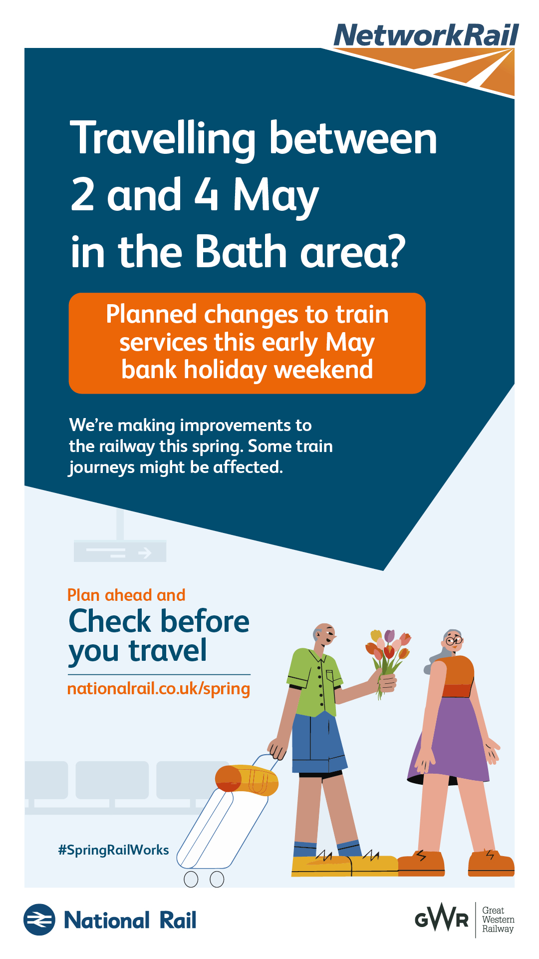 The purpose of this campaign is to raise awareness of planned rail engineering work over the spring bank holiday periods. We are encouraging leisure and business passengers to plan ahead and check if their train journey is affected before they travel by visiting www.nationalrail.co.uk/spring.