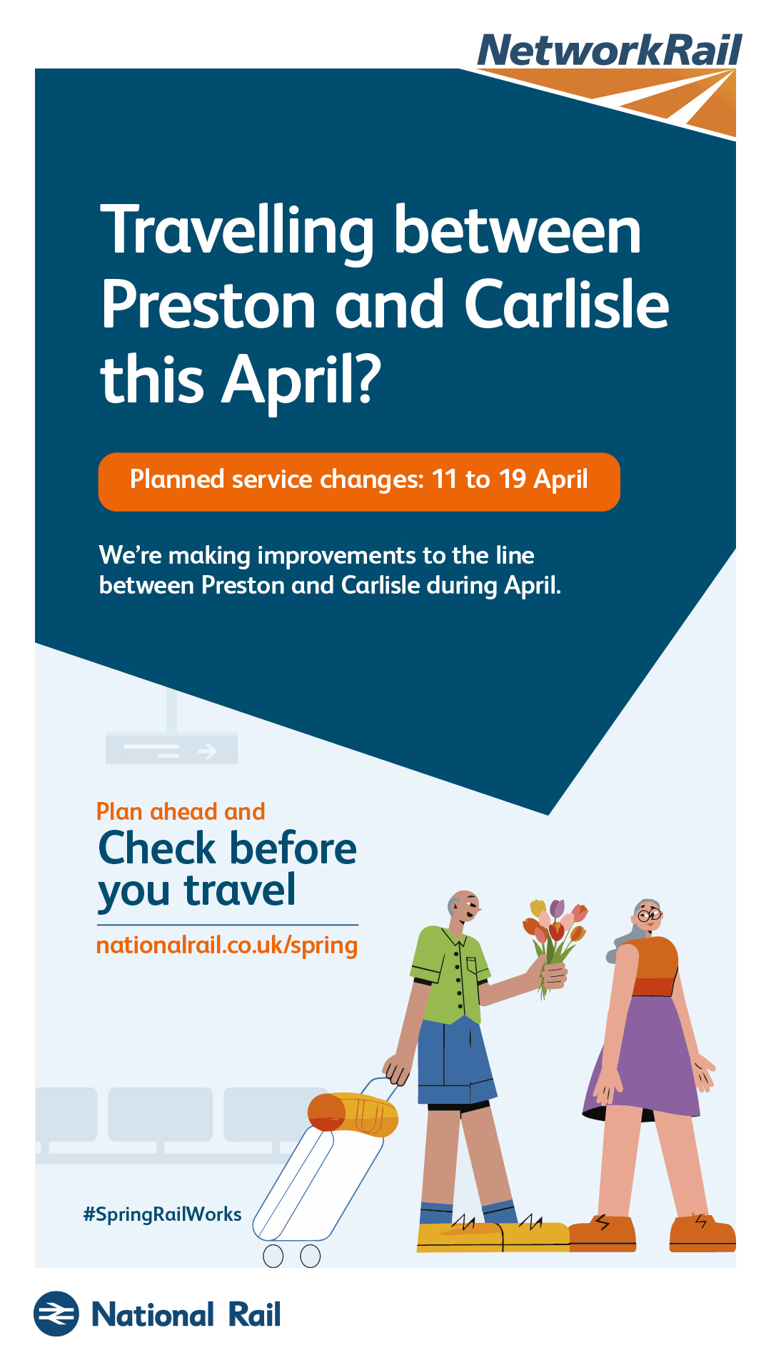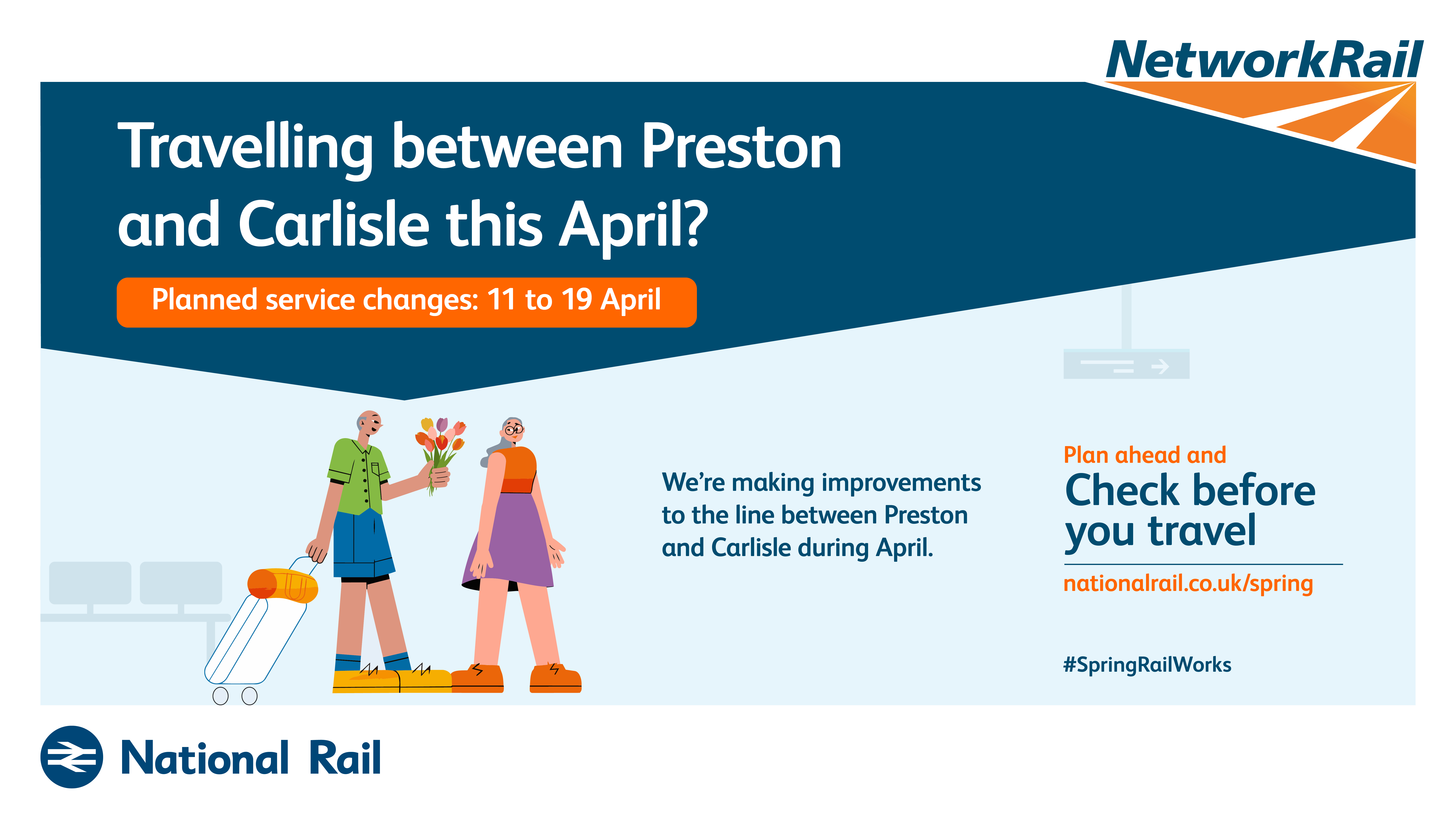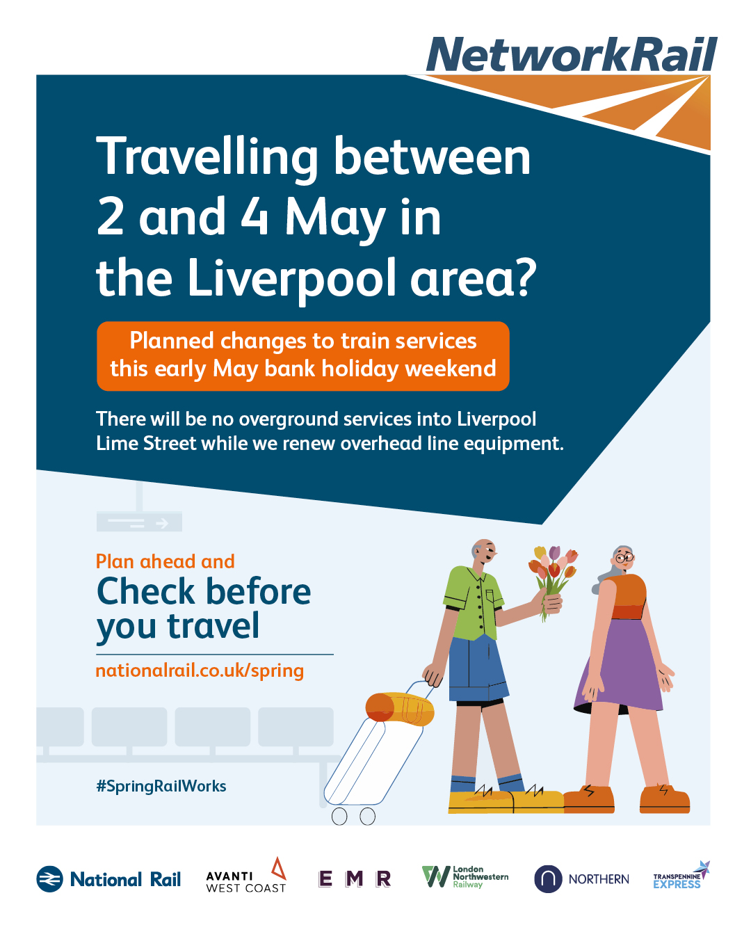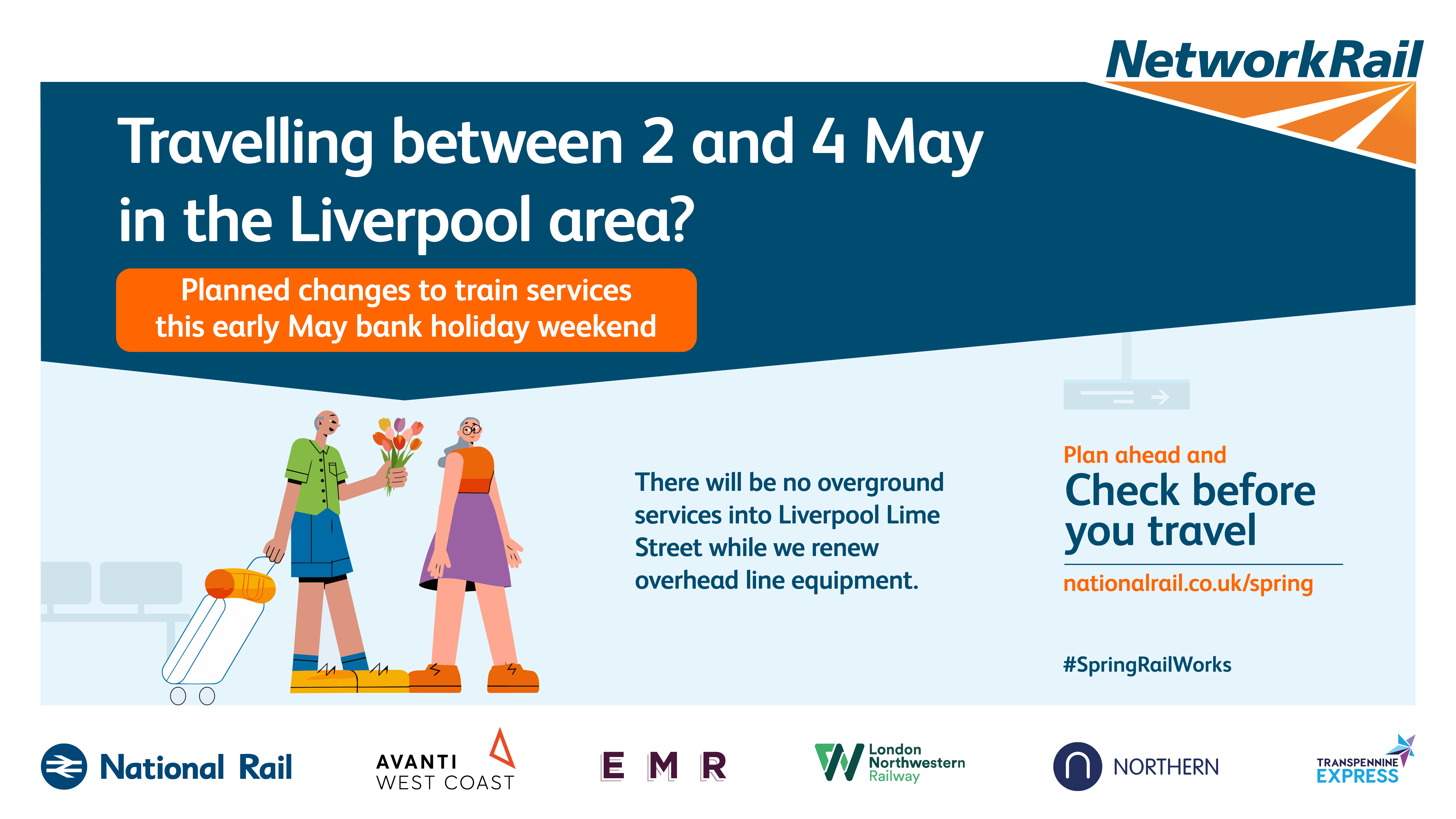 The purpose of this campaign is to raise awareness of planned rail engineering work over the spring bank holiday periods. We are encouraging leisure and business passengers to plan ahead and check if their train journey is affected before they travel by visiting www.nationalrail.co.uk/spring.