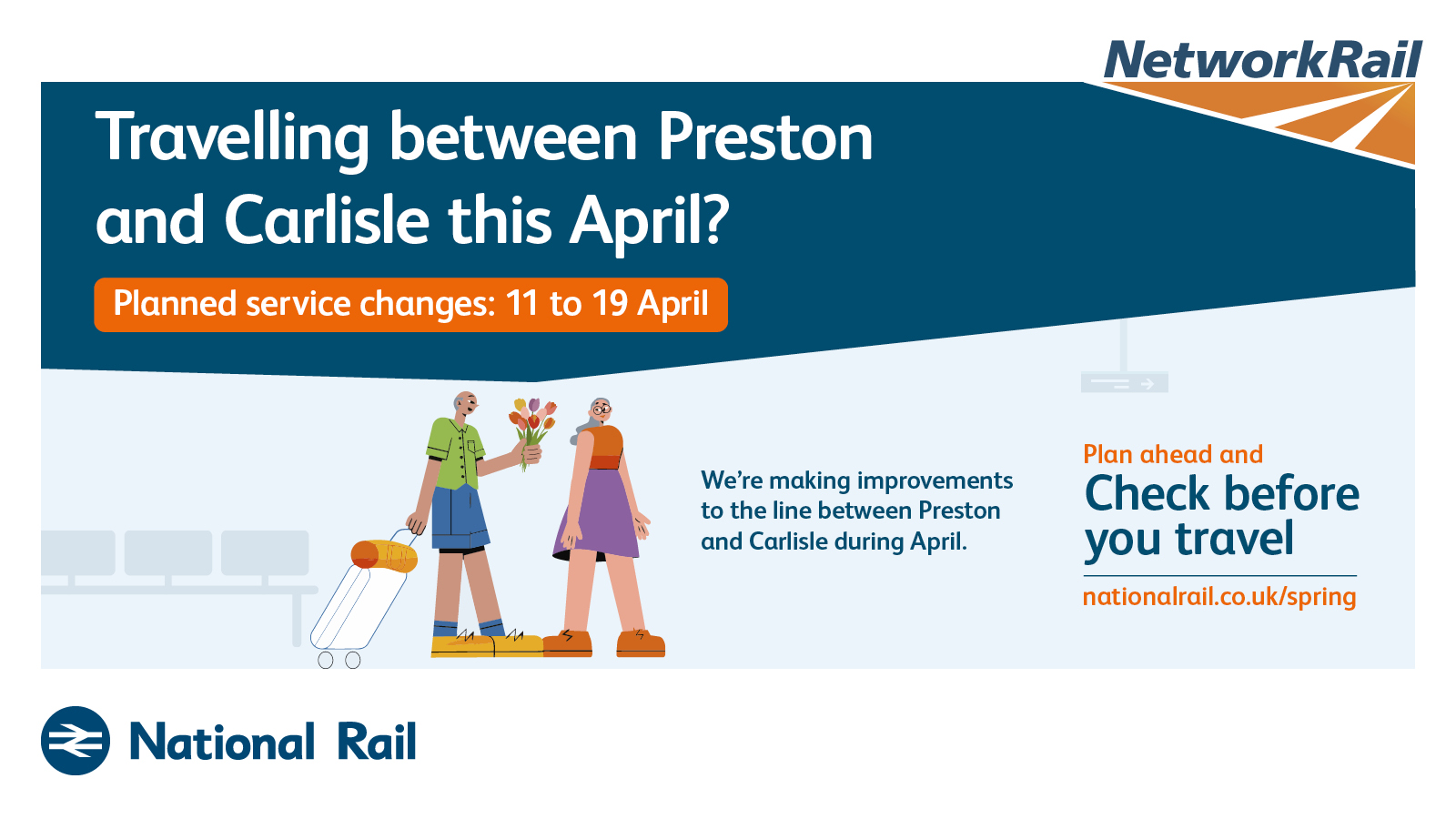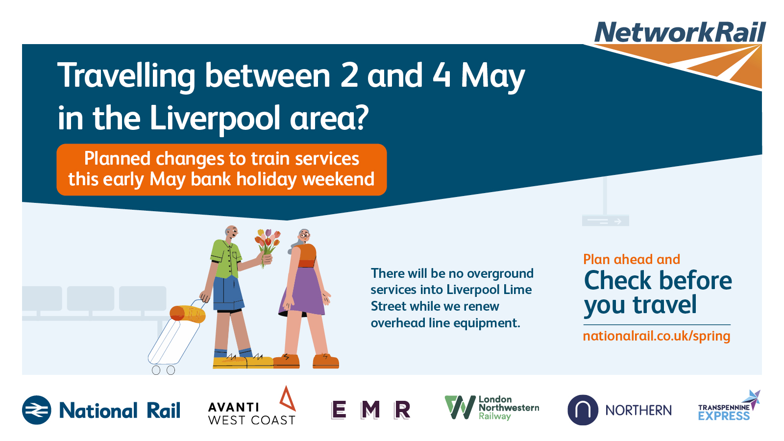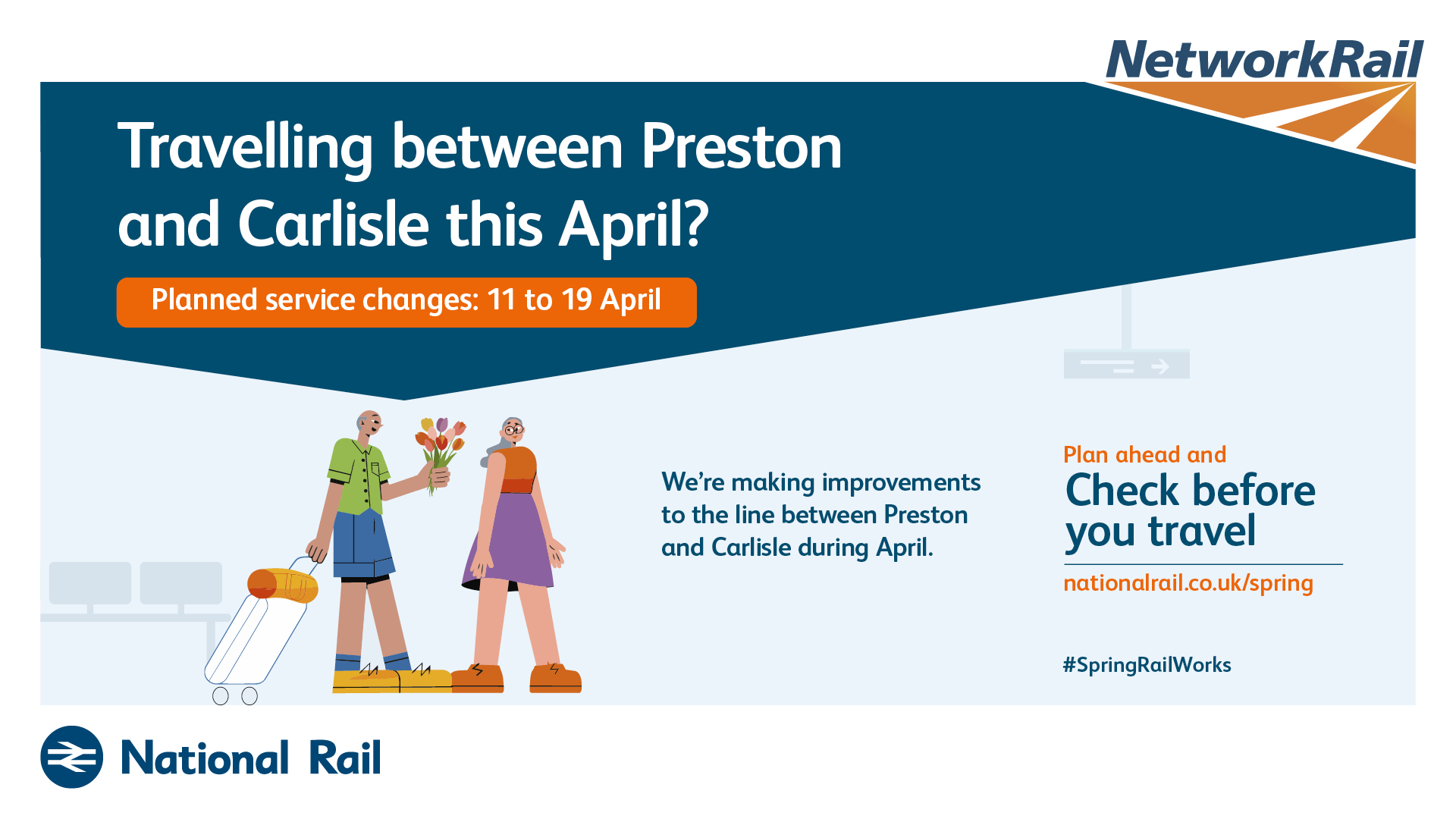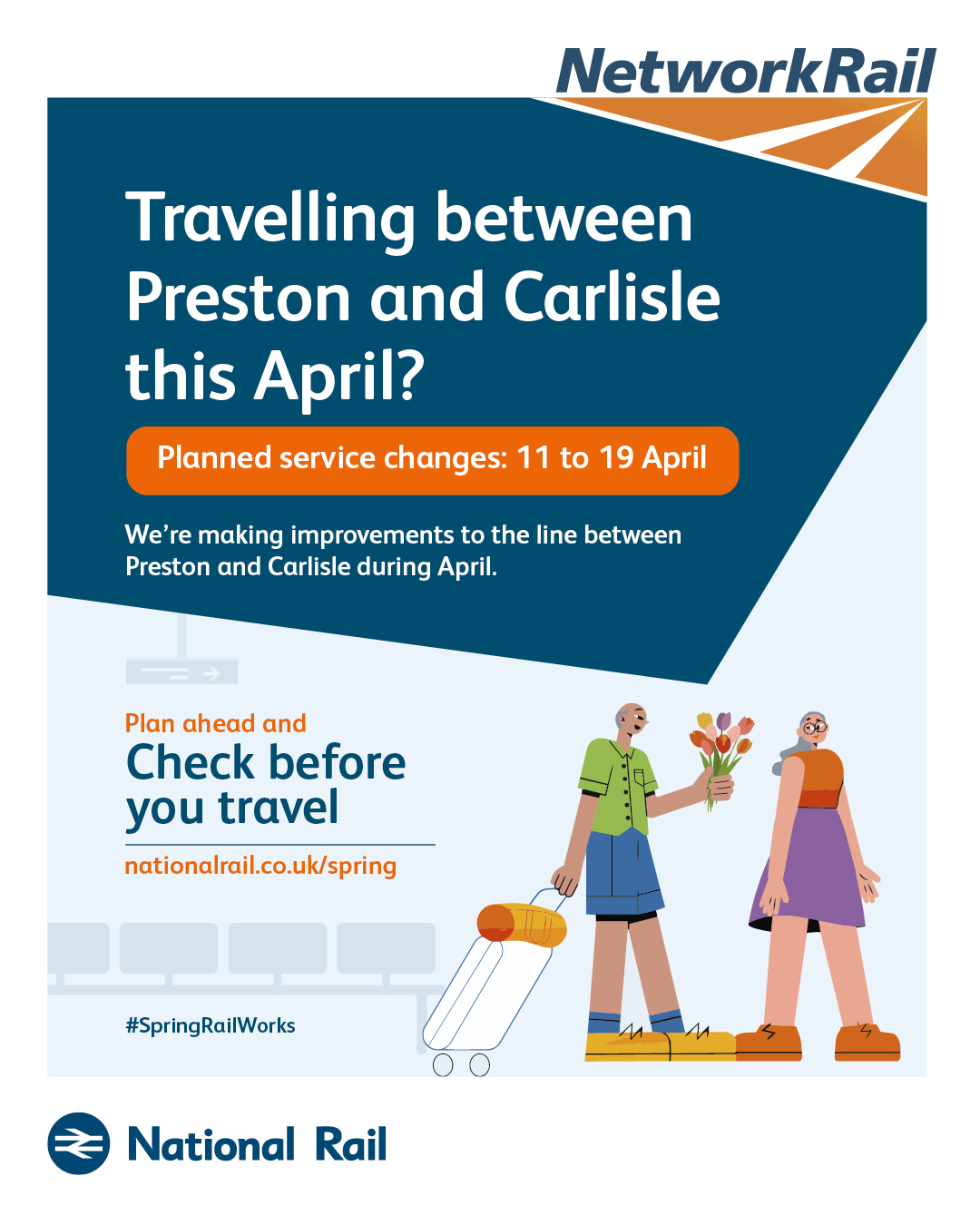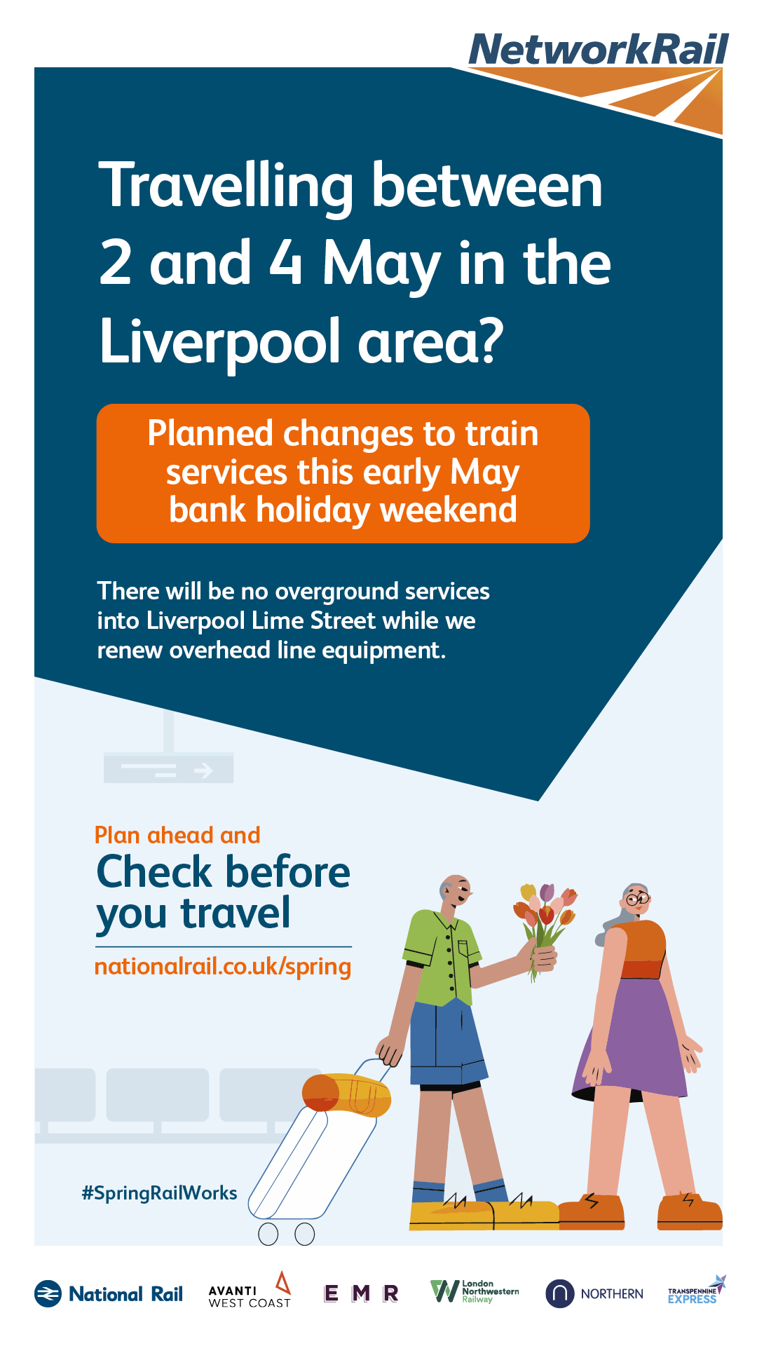The purpose of this campaign is to raise awareness of planned rail engineering work over the spring bank holiday periods. We are encouraging leisure and business passengers to plan ahead and check if their train journey is affected before they travel by visiting www.nationalrail.co.uk/spring.