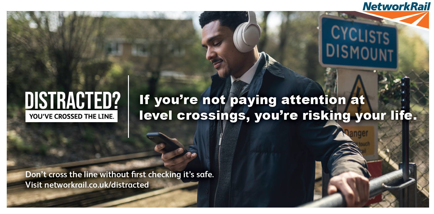 ‘Distracted? You’ve Crossed the Line’ is a public safety campaign, which aims to challenge behaviour that is the result of a distraction. It focuses on high–risk behaviours that a high portion of young adults (aged 18-34) don’t see as dangerous. For example, looking at a phone while using a level crossing, listening to headphones while using a level crossing or even taking selfies on an a level crossing.