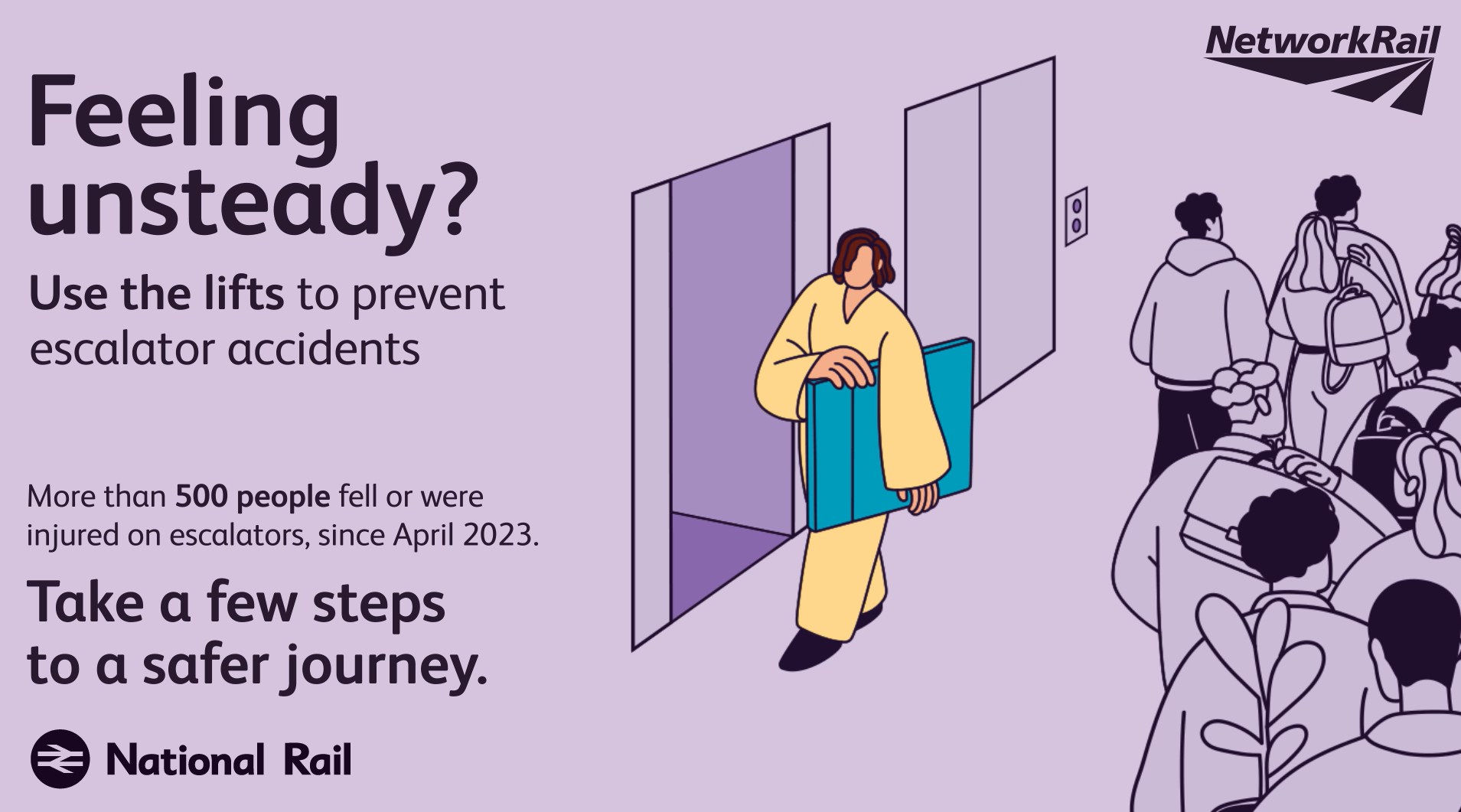 If your station is currently experiencing ongoing issues with lift reliability, please use your discretion to decide whether it’s appropriate to display the escalator safety campaign materials, which promote lift use as a safer alternative. While the campaign is designed to support passenger safety, we understand that station-specific circumstances may affect how and when it’s best applied.